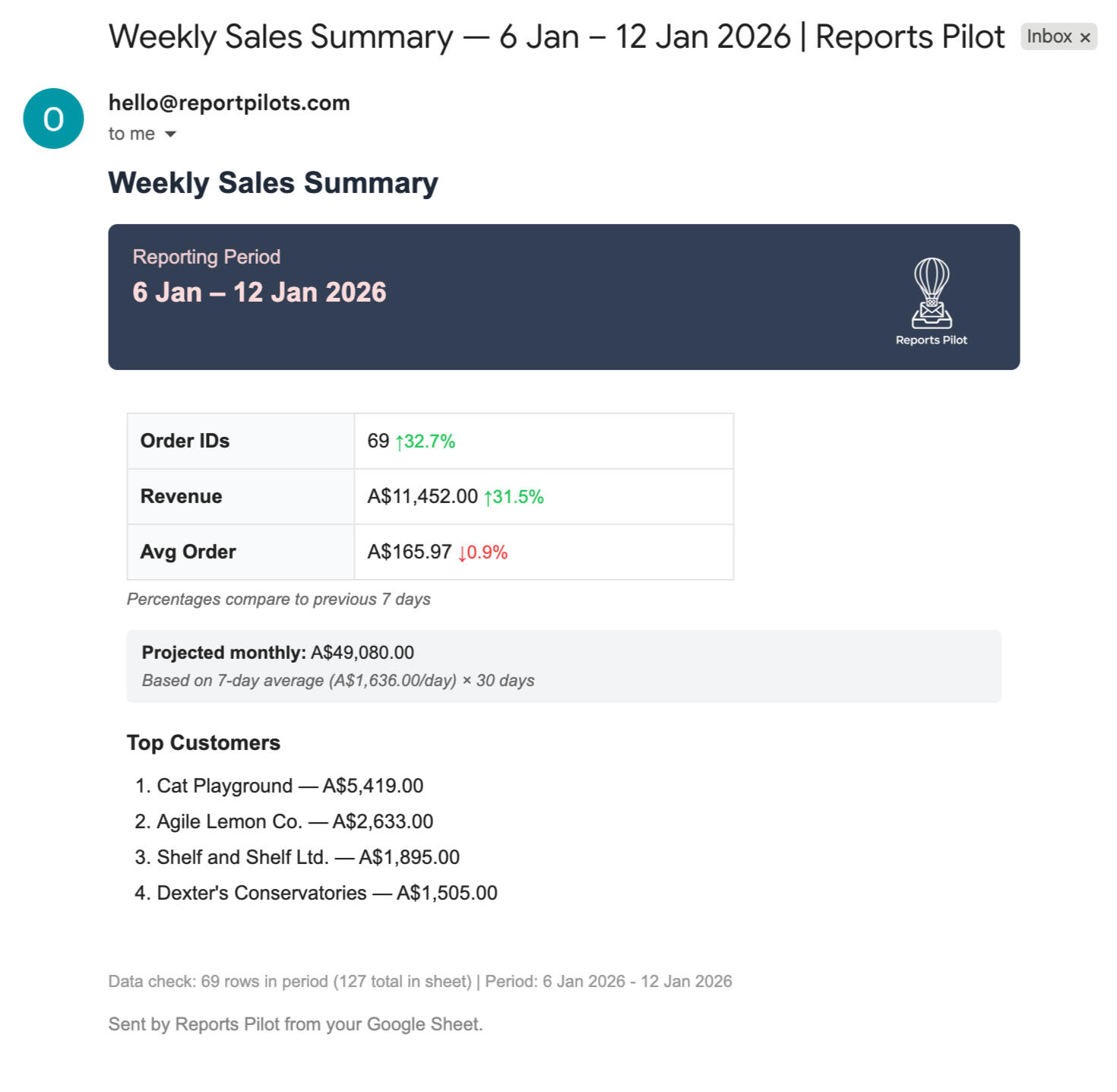 Step 1: Connect your Google SheetReports Pilot works directly with the Google Sheets you already maintain.You stay in control of your data — Reports Pilot does not store or access your data while generating reports.Step 2: Confirm your reporting columnsTo generate accurate reports, Reports Pilot looks for the following fields in your sheet:CustomerOrder IDTotalDateYour column names don’t need to match these exactly.Reports Pilot automatically recognises common variations such as Client, Order Number, Amount, or Order Date.If a required field can’t be found, you’ll be prompted to adjust your column names.Step 3: Choose your report scheduleDecide how and when reports are sent:Automatic reports